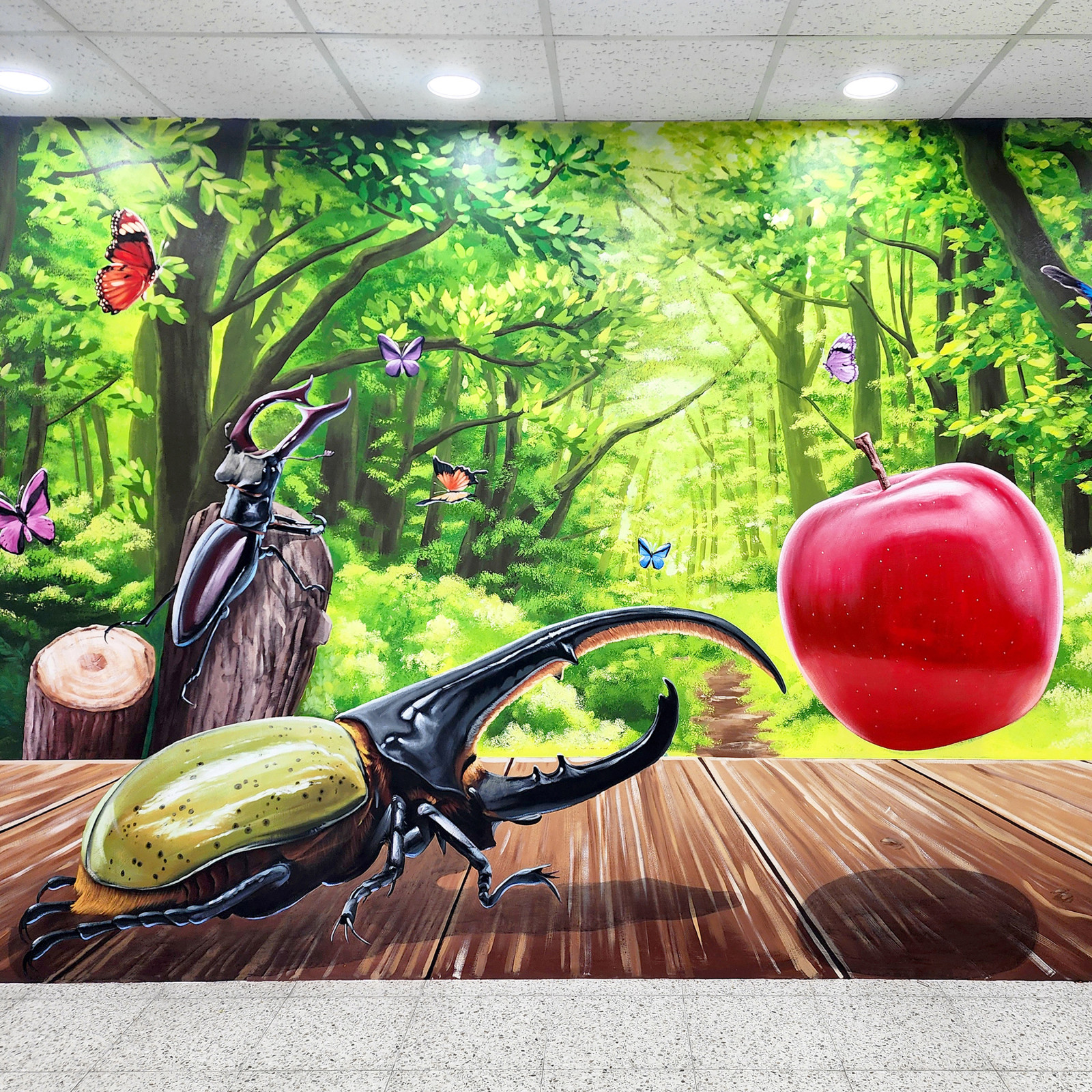 경상남도교육청 과학교육원 곤충표본관 리모델링을 위해 트릭아트 벽화를 제작했습니다. 곤충·숲 테마의 착시 연출로 전시 공간의 몰입도를 높이고, 방문객이 참여할 수 있는 체험형 콘텐츠를 구현한 트릭아트 제작 사례입니다.