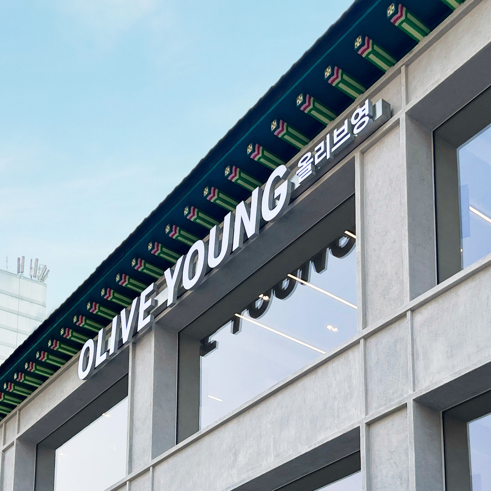 올리브영 매장 외벽 인테리어 | 처마 단청 도색·조형물 시공